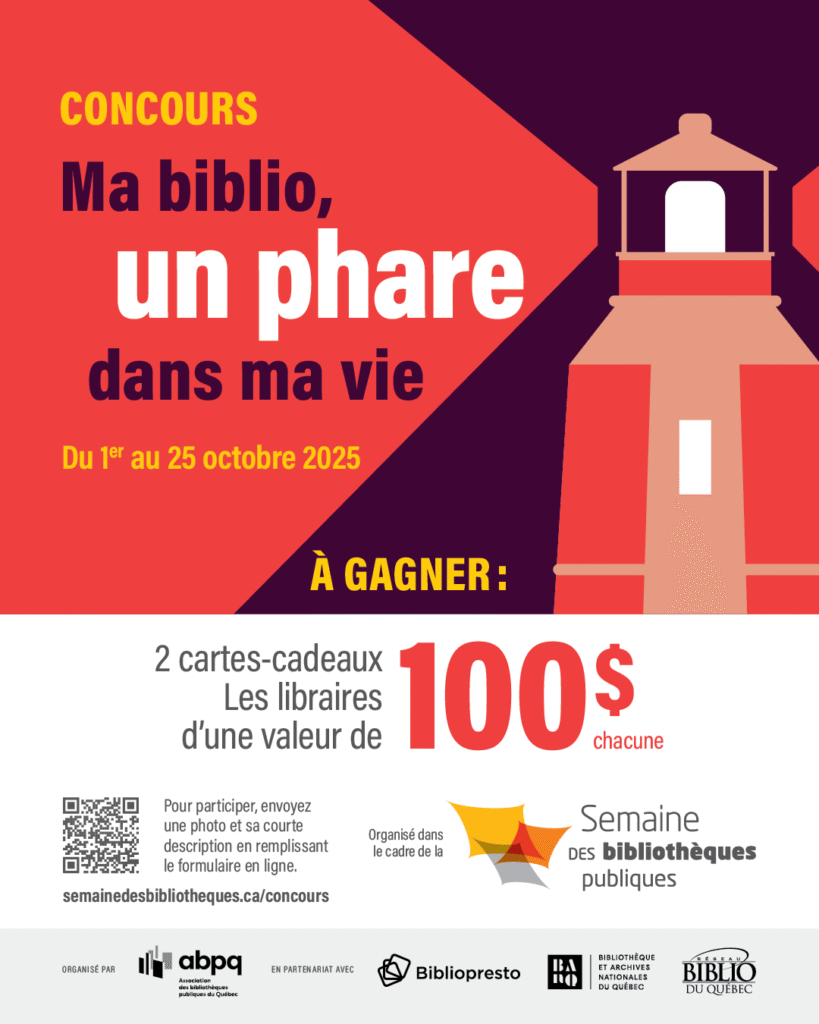 La Semaine des bibliothèques publiques aura bientôt lieu! Pour sa 27e édition, la thématique sera lumineuse : Les biblios, phares dans nos communautés. On s’y enrichit, on aime y passer du temps et on s’y sent en sécurité. La bibliothèque publique nous éclaire au quotidien et nous permet d’avancer dans la vie. Célébrons-là prochainement, ensemble! Infos : www.semainedesbibliotheques.ca