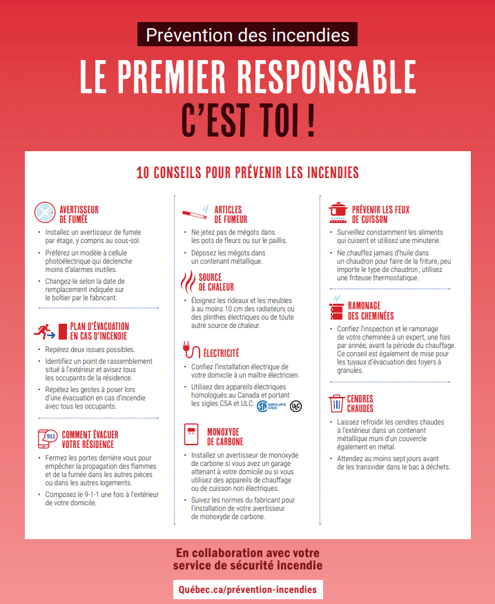 Il s’agit d’un outil de référence pratique à conserver à la maison et à intégrer dans sa trousse d’urgence. On y trouvera des conseils utiles pour prévenir les incendies, savoir comment réagir en cas de sinistre et mieux se préparer aux situations d’urgence sur notre territoire.