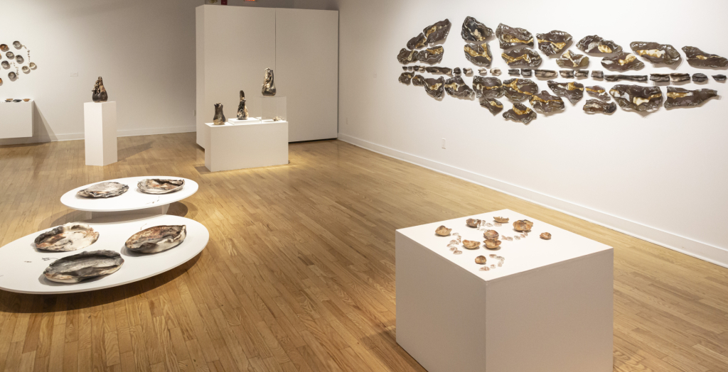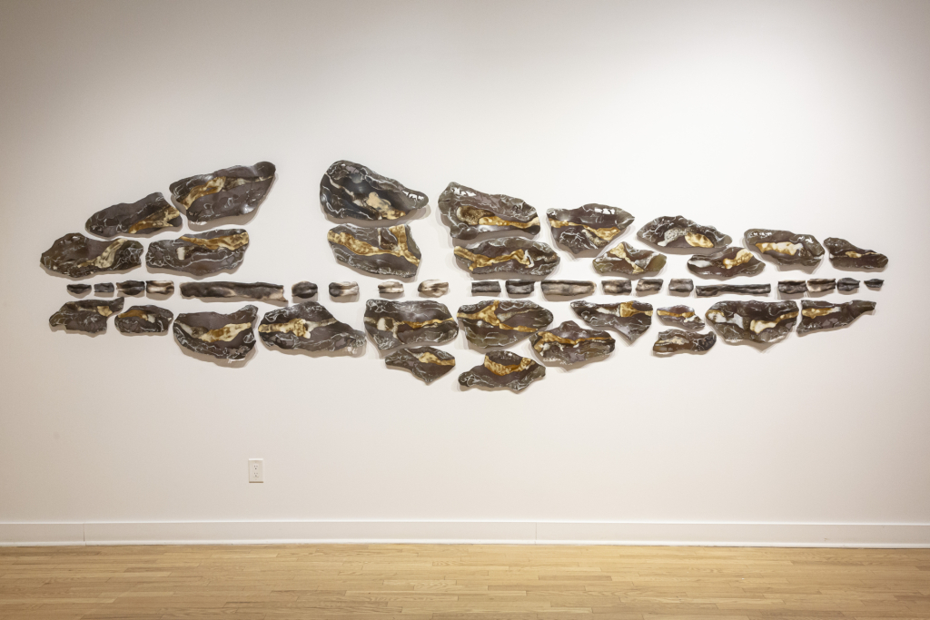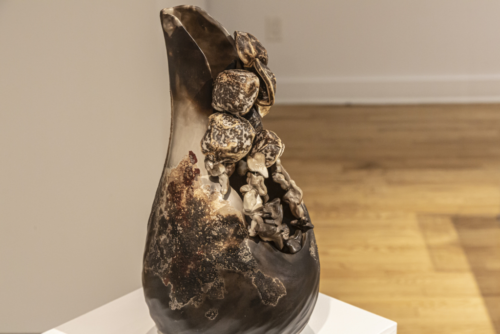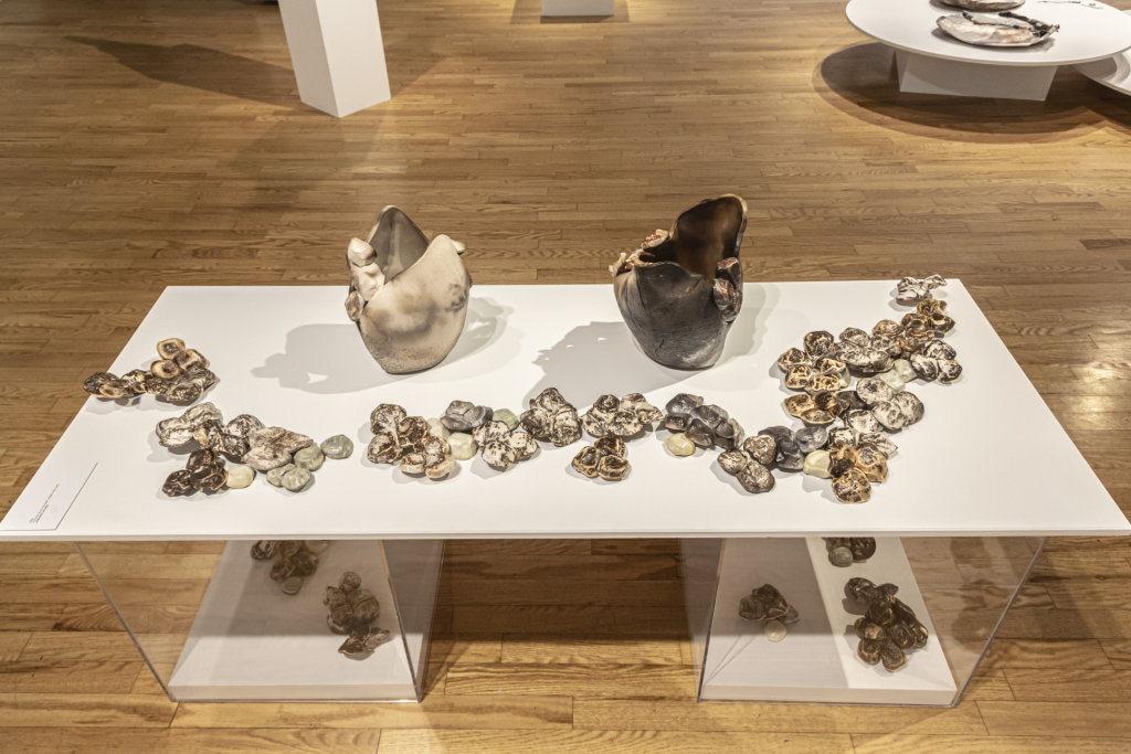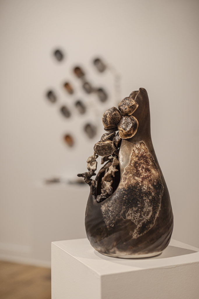 L’exposition regroupe également des traces d’explorations des différents modes de cuisson céramique. En jouant avec les températures et les atmosphères de cuisson, l’artiste crée des effets visuels qui évoquent des structures géologiques. L’intégration d’argile sauvage, dans certaines œuvres, met en valeur les textures et les couleurs naturelles, tout en invitant à réfléchir sur la relation symbiotique entre l’humain et l’environnement.